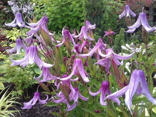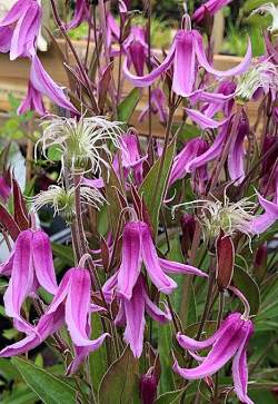 Клематис цельнолистный Hanajima (Ханадзима). Побеги высотой 30-50 см, за опоры не цепляется. В саду используют как многолетник: для украшения цветников, посадки среди хвойных. Цветки колокольчатые, с красивыми закрученными лепестками, розовые.