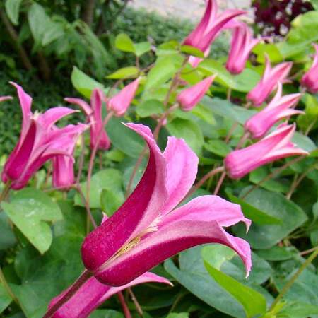 Клематис Happy Diana (Хеппи Диана). Японский обильноцветущий сорт. В группе техасских клематисов это самый крупноцветковый сорт. Цветки диаметром 5-7 см, тёмно-розовые, тюльпановидной формы, распускаются наполовину. Лепестки сильно завёрнутые на концах. Тычинки с жёлтыми пыльниками на бело-кремовых тычиночных нитях. Цветёт на побегах текущего года с середины июня до середины сентября. Высота 300-400 см. Цепляется за опору листовыми черешками.