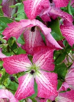 Клематис I am Happy (Ай Эм Хэппи). Цветки диаметром 5-6 см, красные с белой полосой по центру лепестка. Цветёт в конце июня-сентябре на побегах текущего года чрезвычайно обильно. Высота 200 см. Прекрасный компаньон для роз.