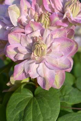 Клематис Innocent Blush (Инносент Блаш). Польский сорт селекции Щепана Марчиньского, в продаже с лета 2012 г. Цветки на прошлогодних побегах с более вытянутыми внешними чашелистиками и все более короткими по мере приближения к центру. Чашелистики светло-розовые, с более темным тепло-розовым румянцем по краям.