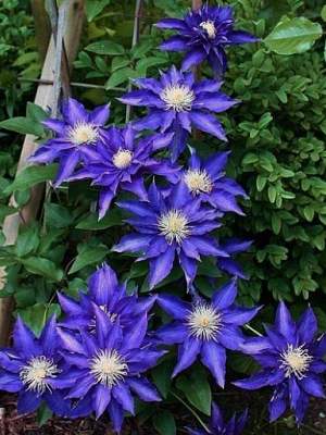 На побегах текущего года цветки простые диаметром 10-12 см, чаще всего с шестью слегка скрученными светло-розовыми чашелистиками. Тычинки со светло-желтыми пыльниками на кремовых нитях. Цветение приходится на конец мая — июль и повторяется в сентябре.