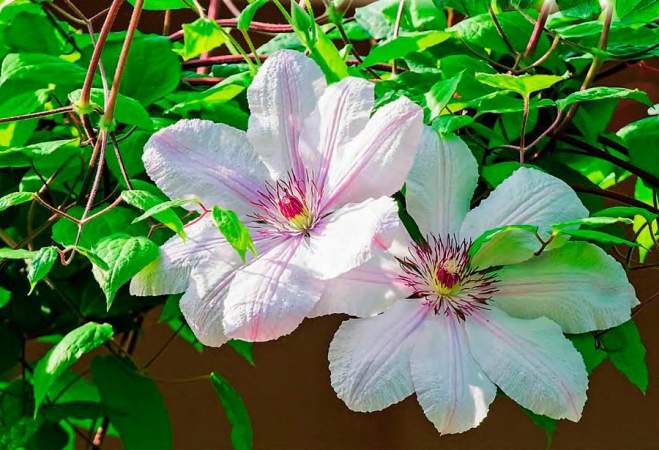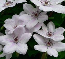 Клематис Jan Pawel II (Иоанн Павел II). Устойчивый сильнорастущий, долгоцветущий (июнь-сентябрь) польский сорт. Цветки крупные, алебастрово-белые, со светло-розовой полоской, особенно выразительной во время осеннего цветения, тычинки тёмно-красные. Используется для выращивания ограждений, стен, беседок, пергол, решеток. Может карабкаться по натуральным опорам, небольшим деревьям, большим кустарникам лиственным. Особенно хорош с низкими кустарниками, закрывающие 100 cм от основания.
