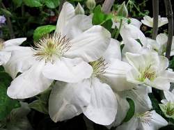 Клематис Jerzy Popiełuszko (Ежи Попелушко). Цветки диаметром 13-15 см, шелковисто-белые, с кофейными пыльниками на белых тычиночных нитях.