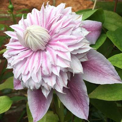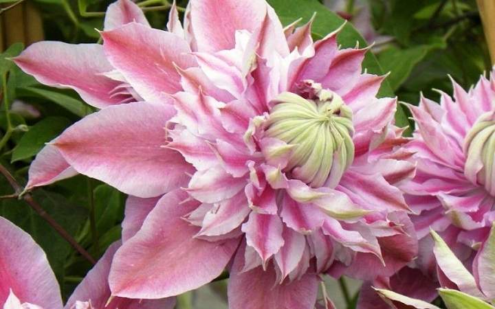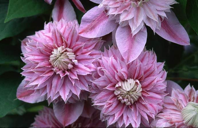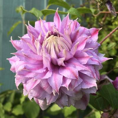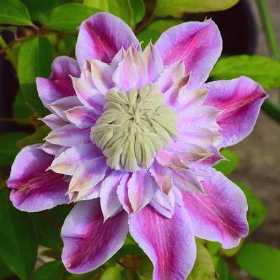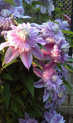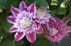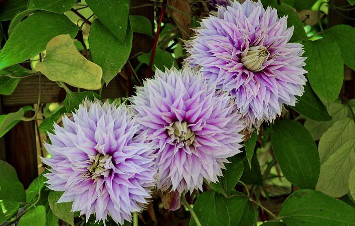 Клематис Josephine (Жозефина). Один из хитов Раймонда Эвисона. Шикарные крупные (до 15 см) густомахровые цветки держатся на лиане до четырех недель. Цветки всегда махровые, летние более насыщенного цвета, в окраске проявляется лиловый цвет. По мере того как чашелистики отгибаются, цветок все больше становится похож на помпон.