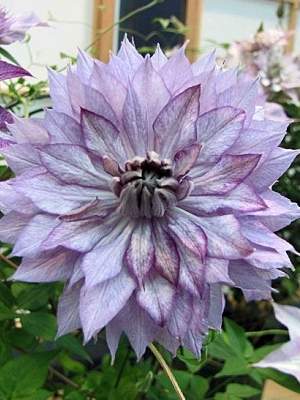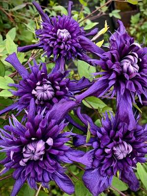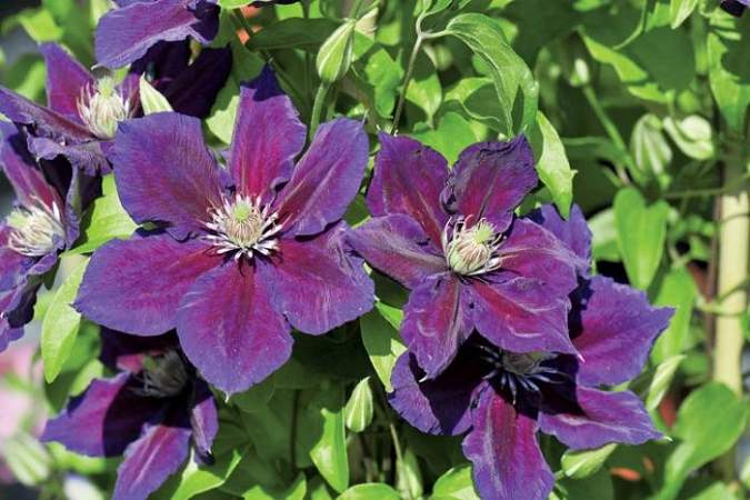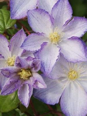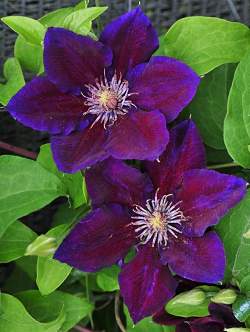 Клематис Julka (Юлька). Сорт с крупными бархатистыми двухцветными цветками: темно-фиолетовыми с темно-красной полоской по середине лепестков и светлыми тычинками. Цветёт с июня по август. Вырастает до 2,5 м.