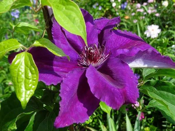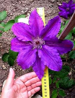 Клематис Kacper (Каспер). Прекрасный польский сорт с исключительно крупными, темно-фиолетово-голубыми цветками и фиолетовыми тычинками. Цветёт в июне-июле, повторно в сентябре. Особенно хорош для выращивания у оград, стен, беседок, пергол, решеток.