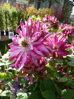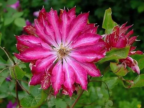 Клематис Kaen (Каен). Японский интригующий сорт со светло-красными махровыми и полумахровыми цветками диаметром 8-14 см. Чашелистики неправильной формы, широко-ланцетообразные, остро заканчивающиеся, светло-красные с розовой полоской посередине, все более светлые в направлении основания, с зелеными тенями, наиболее заметными на наружных лепестках. Тычинки с темно-розовыми нитями и светло-желтыми пыльниками.
