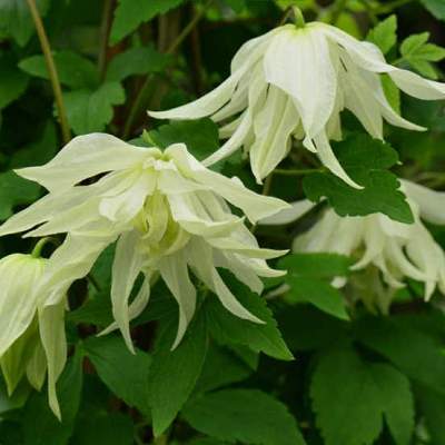 Клематис (княжик) Lemon Dream (Лемон Дрим). Цветки всегда махровые, очень крупные для группы Атрагене (диаметром 10-12 см), светло-лимонного цвета, во время распускания бутонов — зеленоватые, а когда полностью распустятся белеют, колокольчатые, свешивающиеся, приятно пахнущие грейпфрутом, сидящие на пурпурных цветоножках. Цветки имеют 4 чашелистика и 12-15 ланцетовидных, слегка волнистых, остро заканчивающихся стаминодий. Тычинки с желтыми пыльниками на зеленовато-лимонных нитях и светло-желтыми пестиками.