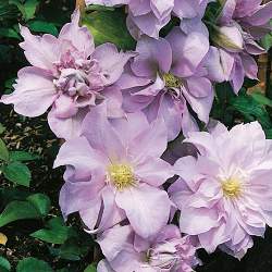 Клематис Louise Rowe (Луис Роу). Сорт с махровыми, полумахровыми или одиночными цветками, образуемыми на прошлогодних побегах в мае-июне. Повторяет цветение в августе-сентябре, образуя на побегах этого года только одиночные цветы.