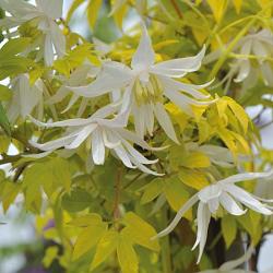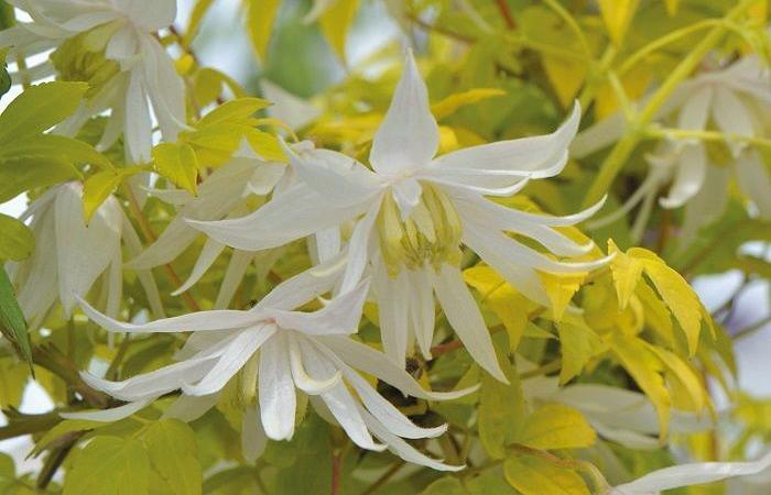Клематис Luminous Snow (Люминус Сноу). Желтолистный клематис польской селекции. Цветки махровые, диаметром 7 см, колокольчатые, широко открытые, состоят из 4 широких чашелистиков и до 16 длинных, волнистых стаминодий. Лепестки белые. Цветение в мае.