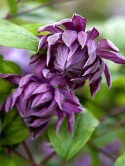 Клематис Mary Rose (Мэри Роуз). Очень известный сорт с очаровательными, всегда махровыми цветками, благодаря которым растение выглядит в стиле "ретро". Идеально подходит для "исторических" садов. Цветки диаметром 3-6 см, фиолетовые с пепельным оттенком. Лепестки многочисленные, закрученные и сложенные в розетку.