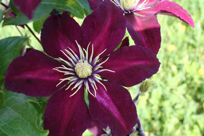 Клематис Mazowsze (Мазовше). Отличается мощной силой роста. В высоту лиана достигает 3-3,5 м. Зацветает красивыми большими цветками в июне, цветение продолжается все лето. Бархатистые цветы диаметром 15-20 см, бордового цвета, состоят из 6 лепестков. Клематис обильно цветет, если обеспечить ему хорошие условия выращивания. Растение выдерживает низкие температуры, проявляет стойкость к возбудителям заболеваний.