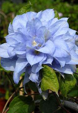 Клематис Mazury (Мазуры). Цветки махровые на побегах этого года, крупные — диаметром 15-17 см, голубые со светлыми пятнами. По краю лепестка зеленые вкрапления. В начале цветения цветки имеют красивую регулярную структуру — выглядят как сделанные из папиросной бумаги. Отцветая, широко раскрываются, обнажая кремовые пестики.