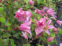 Клематис Mienie Belle (Мини Бел). Очень оригинальные тюльпановидные, смотрящие вверх нежно-розовые цветки обильно покрывают лозу с июля по октябрь. Осенью и зимой украшен декоративными соплодиями. Используется для посадки у беседок, пергол, различных садовых опор, решёток, ограждений. Цветёт в конце июня-сентябре на побегах текущего года.
