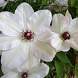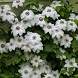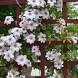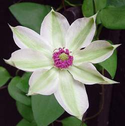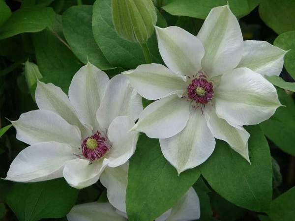 Клематис Miss Bateman (Мисс Бэйтман). Белые цветки украшены красными пыльниками, типичными только для этого белоцветкового клематиса. Цветки, только раскрывшись имеют заметную зеленую полосу посередине лепестка и легкий розоватый оттенок по краям. Затем цветки белеют, а тычинки становятся еще темнее, что дает красивый контраст.