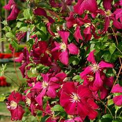 Клематис Mme Julia Correvon (Мадам Джулия Корревон). Здоровый, обильно цветущий сорт. С июня до сентября покрывается многочисленными цветками, винно-красными с жёлтыми тычинками. Довольствуется бедными почвами.