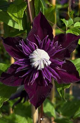 Клематис Mofashi (Мофаши). Флорида. Цветок густо-пурпурный, тыльная сторона лепестков белая. В центре многолепестковой "тарелочки" шар из петалодий, которые раскрываются постепенно. В полураскрытом виде кажется, что в центре цветка расположена большая жемчужина. Цветок около 10 см в диметре. Очень хорош для выращивания в контейнерах или с невысокими плетистыми розами светлой окраски. Цветки всегда махровые.