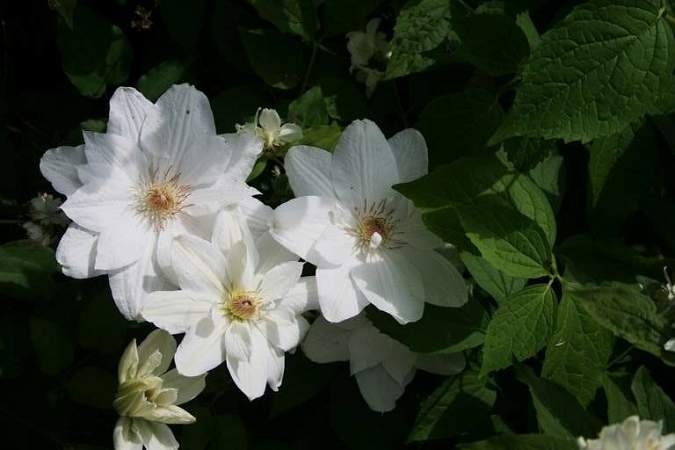 Клематис Mrs George Jackman (Джордж Джекмен). Обильноцветущий сорт с белыми цветками и кофейными тычинками. На прошлогодних побегах в июне появляются полумахровые цветки, на побегах этого года в июле-августе — одиночные цветки. Умеренно растущий. Особенно красиво смотрится на тёмном фоне.