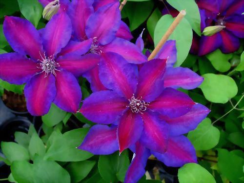 Клематис Mrs N. Thompson (Миссис Н. Томпсон). Яркие двухцветные цветки с голубыми лепестками с бархатисто-красной полоской посередине; тычинки красные. Цветёт в мае-июне и повторно в сентябре. Используется для посадки между кустарниками.