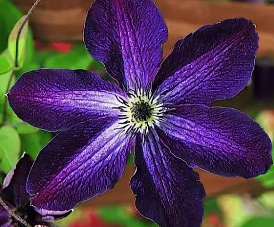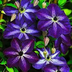 Клематис Night Veil (Найт Вейл). Сорт японской селекции. Цветки диаметром 7-8 см, состоят из 4-6 лепестков пурпурно-синего цвета со светлой, почти белой у основания, полосой посередине лепестков. Тычинки с пурпурно-фиолетовыми пыльниками на бело-розовых тычиночных нитях. Цветёт в июне-сентябре на побегах текущего года. Высота 200-250 см.