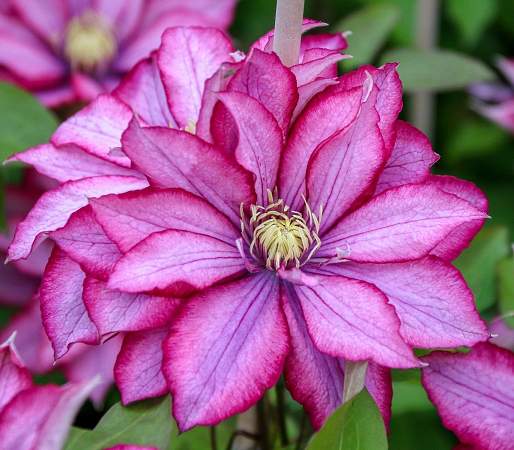 Клематис Paradiso (Парадизо). Цветки полумахровые, до 12 см в диаметре. Окраска необычная — красновато-фиалковая, мягкая. К краям лепестков карминная. Пыльники золотистые на красных нитях. Высота 200 см. Цветет с мая по августа. Подходит для выращивания контейнерах и вазонах.