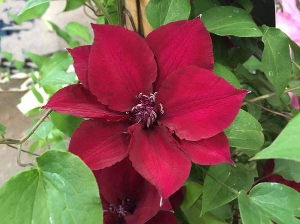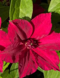 Клематис Perida (Перида). Цветки среднего размера, диаметром 8-12 см, с шестью красно-пурпурными остро-заострёнными чашелистиками и с красными тычинками. Цветёт в июне-августе. Листья простые или тройчатые, тёмно зелёные.
