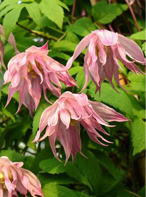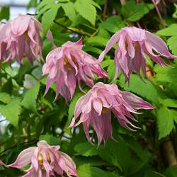 Клематис Pink Swing (Пинк Свинг). Цветки всегда махровые — как на прошлогодних побегах, так и на побегах текущего года, крупные для группы Атрагене (диаметром 10-12 см), колокольчикообразные, свешивающиеся, слегка пахнущие грейпфрутом, сидят на пурпурных цветоножках. Цветки складываются из 4 эллипсообразных, вытянутых, остро заканчивающихся со слегка волнистыми краями чашелистиков.