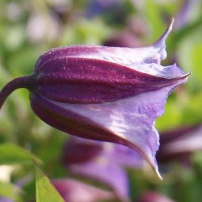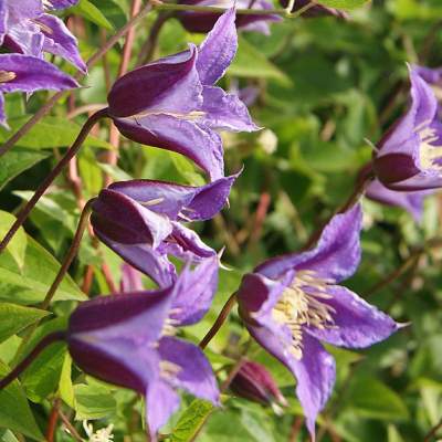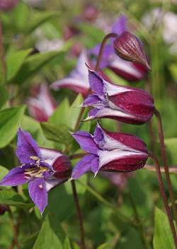 Клематис Prince William (Принц Вильям). Новинка голландской селекции. Гибрид клематиса техасского. Сорт с пурпурными бутонами. Цветки пурпурно-фиолетовые с ярко-лиловой каймой, пыльники желтые. Высота 200 см. Группа обрезки третья (сильная).