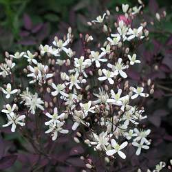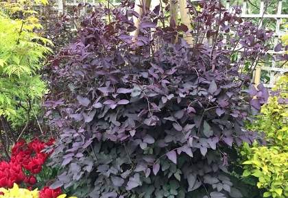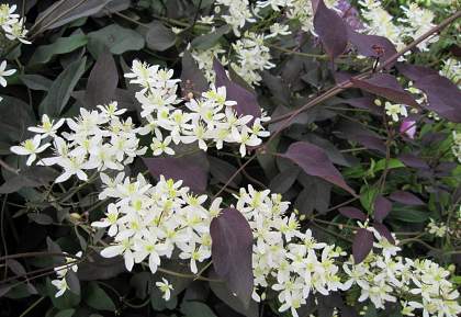 Клематис прямой Purpurea (Пурпуреа). Группа Flammula. Цветет на побегах текущего года. Раскидистый густой травянистый многолетник (не лиана), требует опоры, без опоры стелется по земле, как почвопокровное растение. Листва весной дымно-фиолетовая, к середине лета зеленеет.