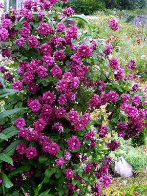 Клематис Purpurea Plena Elegans (Пурпуреа Плена Элеганс). Цветки бордовые, всегда махровые, похожи на помпоны. Прекрасная густая лиана, которой можно смело декорировать арки, перголы, беседки и другие малые садовые сооружения. Все лето покрыта массой махровых живописных бордовых цветков в стиле ретро. Растет быстро и достигает высоты 3 м.