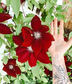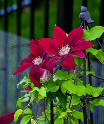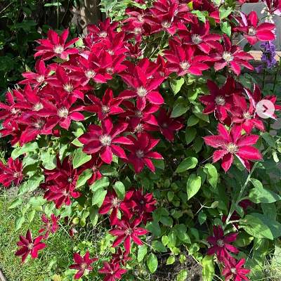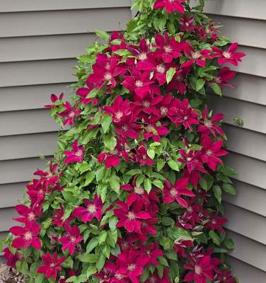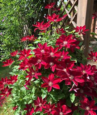 Клематис Rebecca (Ребекка). Крупные выразительные цветы чистого красного цвета, пыльники кремовые. Диаметр цветка до 18 см. Все цветы смотрят вверх. Растение равномерно покрыто цветами с основания до верхушки. Обильное цветение с мая по июнь, повторно с июля до сентября. Высота 200-250 см. Идеален для выращивания в контейнерах.