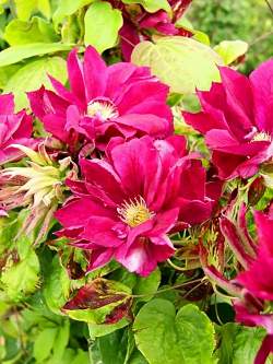 Клематис Red Star (Ред Стар). Японский сорт с красными махровыми и полумахровыми цветками диаметром 10-14 см. Сорт выведен Такаши Ватанабэ (Takashi Watanabe) в 1995 году. Чашелистики неправильной формы, широко-ланцетообразные, c волнистыми краями, остро заканчивающиеся, светло-красные с розовой полоской посередине, всё более светлые в направлении основания, с зелеными тенями, наиболее заметными на наружных лепестках. Тычинки с пурпурными пыльниками на кремово-желтых нитях.
