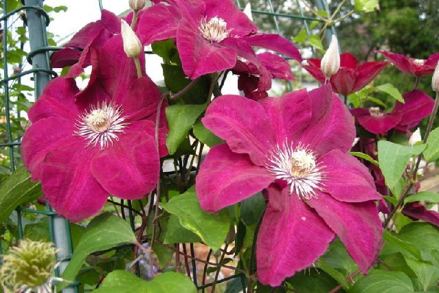 Клематис Rouge Cardinal (Руж Кардинал). Один из самых красных клематисов. Яркие, крупные, бархатные цветы появляются на побегах прошлого года в мае-июне, повторное цветение — июль-август. Средняя скорость нарастания куста.