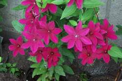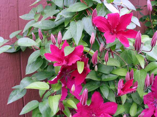 Клематис Ruutel (Рюйтел). Получен от опыления сорта 'Ernest Markcham'. Компактный невысокий клематис высотой 1-1,5 м. Цветки звездообразные, диаметром до 16 см. Чашелистиков шесть, они эллиптические, с волнистыми краями, красно-пурпурные, края более ярко окрашены. Тычиночные нити пурпурные, пыльники светло-серо-пурпурные.