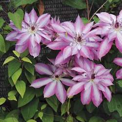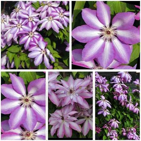 Клематис Serafina (Серафина). Польский сорт со светло-фиолетово-розовыми цветками диаметром 20-22 см, сложенными из 6-8 узких эллипсовидных остро заканчивающихся чашелистиков со светлой, почти белой полосой посередине. Тычинки с пурпурными пыльниками на кремовых нитях.