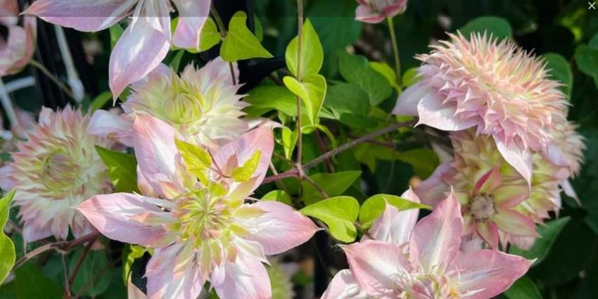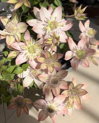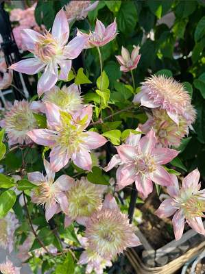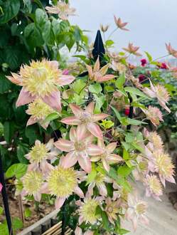 Клематис Shamshel (Шамшел). Флорида. Японская селекция. Высота лианы до 150 см. Цветок необычайно привлекательный — в розовых, желтых и бежевых тонах. Стоит сажать рядом с террасой, крыльцом, верандой, чтобы любоваться игрой оттенков вблизи. Очень хорош для выращивания в контейнерах. Цветки всегда махровые.