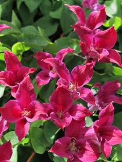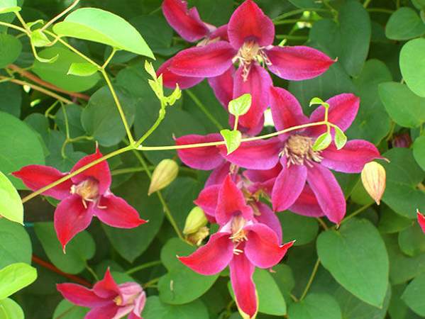 Клематис Sir Trevor Lawrence (Сэр Тревор Лоуренс). Сорт с красивыми тюльпановидными цветками, багровыми внутри и темно-розовыми снаружи. После их полного распускания видны желтые тычинки. Обильно цветет с июня по сентябрь. Предпочтительно сажать на теплых, солнечных участках. Подходит для выращивания у беседок, пергол, на различных садовых опорах, например, сетках, ограждениях. Красиво выглядит на небольших деревьях и кустарниках, лиственных или хвойных.