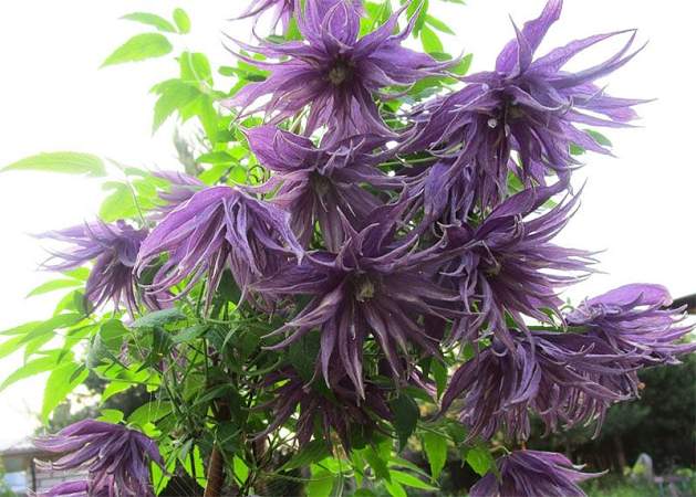 Клематис Spiky (Спайки). Клематис Спайки относится к группе раннецветущих, цветы появляются уже в начале мая, обильное цветение продолжается более месяца. Цветки очень красивые, махровые или полумахровые с узкими чашелистиками. Иногда бывает повторное цветение в августе – сентябре. Пушистые соплодия украшают куст до самой зимы. Куст сильный, хорошо нарастает, побеги поднимаются на высоту до 3 м. Для этого клематиса обрезка не требуется, зимует без укрытия на опоре. Высаживать клематис следует на солнце, или в легкой полутени.