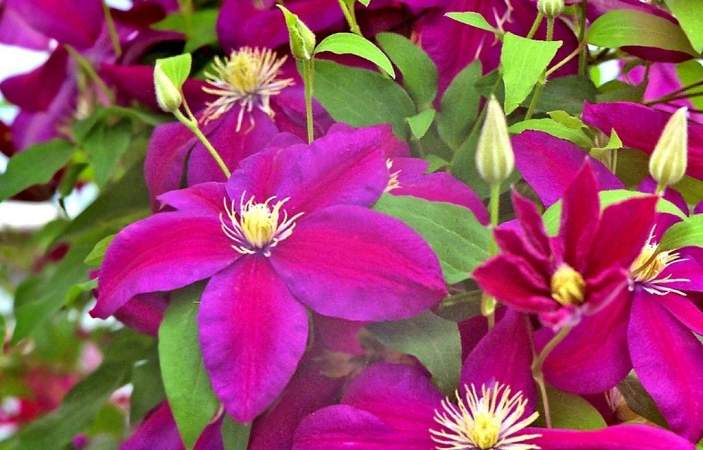 Клематис Sunset (Сансет). Эффектный сорт с искристыми, красно-розовыми цветками с золотистыми тычинками. Цветёт с мая до сентября. Особенно хорош для выращивания у оград, стен, беседок, пергол, решёток и пр. Может карабкаться по натуральным опорам, например, небольшим деревьям и кустарникам.