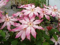 Клематис Tae (Тае). Японский сорт с цветами диаметром в 15-20 см, состоящими из 8 белых, розоватых по краям, узко-эллиптических, остро законченных чашелистников, с неровными краями розово-красного цвета. Тычинки с нитками кремового цвета и пыльниками пурпурного цвета.