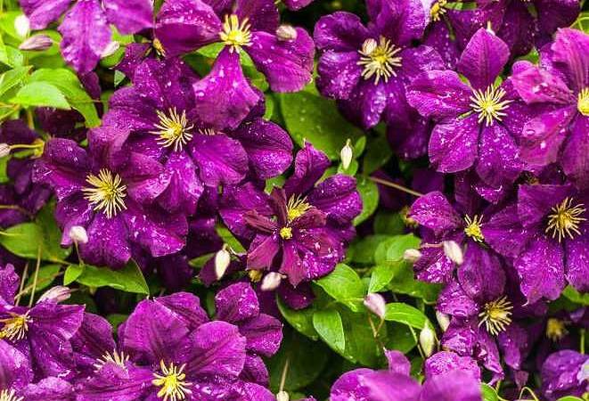 Клематис The Heroes of Warsaw (Герои Варшавы). Цветет обильно и длительно. Цветки до 14 см в диаметре, пурпурные, лепестки бархатистые. Тычинки золотистые. Высота до 300 см. Цветение в июне-августе сначала на прошлогодних побегах, а затем на побегах текущего года.