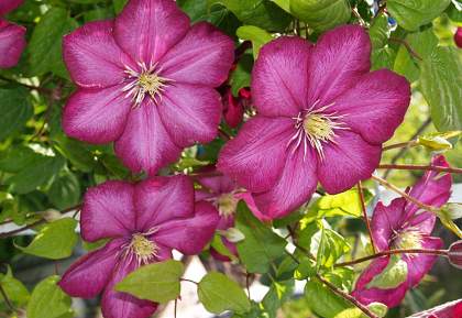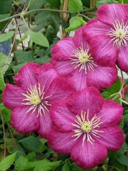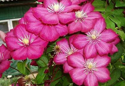 Клематис Ville de Lyon (Виль де Лион). Старинный французский сорт, любимый всеми садоводами. Устойчивый и обильно цветущий. Цветки округлые, ярко-карминовые с золотистыми тычинками, распускаются с конца мая до сентября.