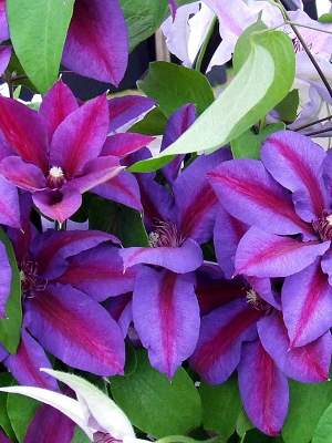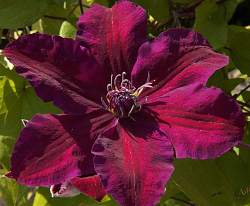 Клематис Westerplatte (Вестерплатте). Яркие бархатистые красно-малиновые цветы до 15 см в диаметре; легко и рано зацветает на низко обрезанных прошлогодних побегах. Цветение на побегах текущего года с конца июля.