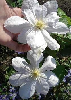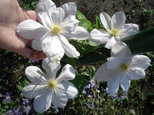 Клематис White Arabella (Вайт Арабелла). Цветки диаметром 5-7 см, белые, в июне полумахровые, затем простые. Цветёт обильно и длительно, в июне-сентябре. Листья тёмно-зелёные, красиво контрастируют с белыми цветками. Высота 120-150 см. Может вести себя и как ампель, красиво свешиваясь с края террасы, и как почвопокровный, но лучше всего смотрится на опоре. Сорт получил Бронзовую медаль на выставке "ПЛАНТАРИУМ-2019".