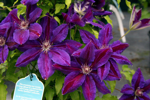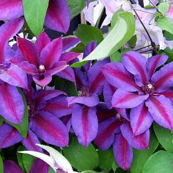 Клематис Wildfire (Уайлдфаер). Польский сорт с цветками диаметром 15-20 cм, сложенными из 6-8 фиолетово-голубых лепестков с красно-пурпурной полосой и волнистыми краями. Тычинки имеют красно-пурпурные пыльники и белые нитки.