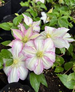 Клематис Yatsuhashi (Яцухаси). Раннецветущий крупноцветковый сорт. Диаметр до 15 см. Цветки лавандово-розового цвета. Раскрываются почти белые, затем появляется розовая кайма и к концу цветения цветок загорает почти полностью. Высота до 180 см. Можно выращивать в контейнерах, на балконах и террасах. Группа обрезки вторая.