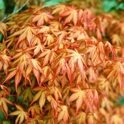 Клен веерный Katsura (Кацура). Великолепная карликовая форма. Вазообразный кустарник или небольшое деревце, к 10-ти годам высота 180 см. После достижения высоты 2 м начинает расти вширь. Листья пятилопастные, длиной всего лишь 3-4,5 см, мелкозазубренные по краю, при распускании зеленовато-жёлтые с оранжевыми краями, затем светло-зелёные, осенью ярко-оранжевые. Черешки листьев красноватые.