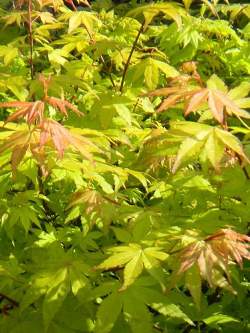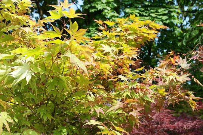 Клен веерный. Декоративен в течении всего периода вегетации формой кроны и тонким орнаментом листа. Родом из Японии, Кореи и Китая; его называют также клён пальчатый, или веерный, или пальмовый. Относится он к группе так называемых "японских клёнов". Эта группа объединяет невысокие декоративные клёны с компактной сквозистой кроной листьев разнообразной формы и окраски.