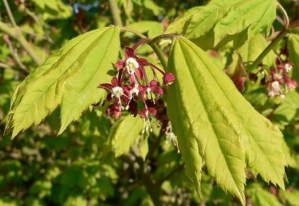 Листопадный кустарник или деревце до 12 м высотой, с округлой кроной; тонкими голыми ветвями и блестящими, пурпурными однолетними побегами. Листья 7-9-лопастные, в очертании округлые, до 12 см в поперечнике. Осенью листья очень эффектны своей окраской, от темно-красных до оранжевых тонов.