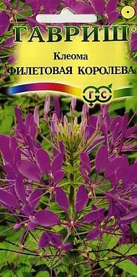 Клеома Фиолетовая Королева 0,3 г Н9. Однолетнее полукустарниковое растения высотой 90-150 см. Цветки фиолетовые, очень своеобразные, похожие на паучка — четыре лепестка венчика расположены с одной стороны цветка, а с другой — тонкие и длинные тычинки и столбик. Цветки собраны в конечную многоцветковую кисть, распускаются снизу вверх и кисть при этом постепенно вытягивается. Из отцветших цветков образуются направленные в стороны вытянутые коробочки на длинных плодоножках.